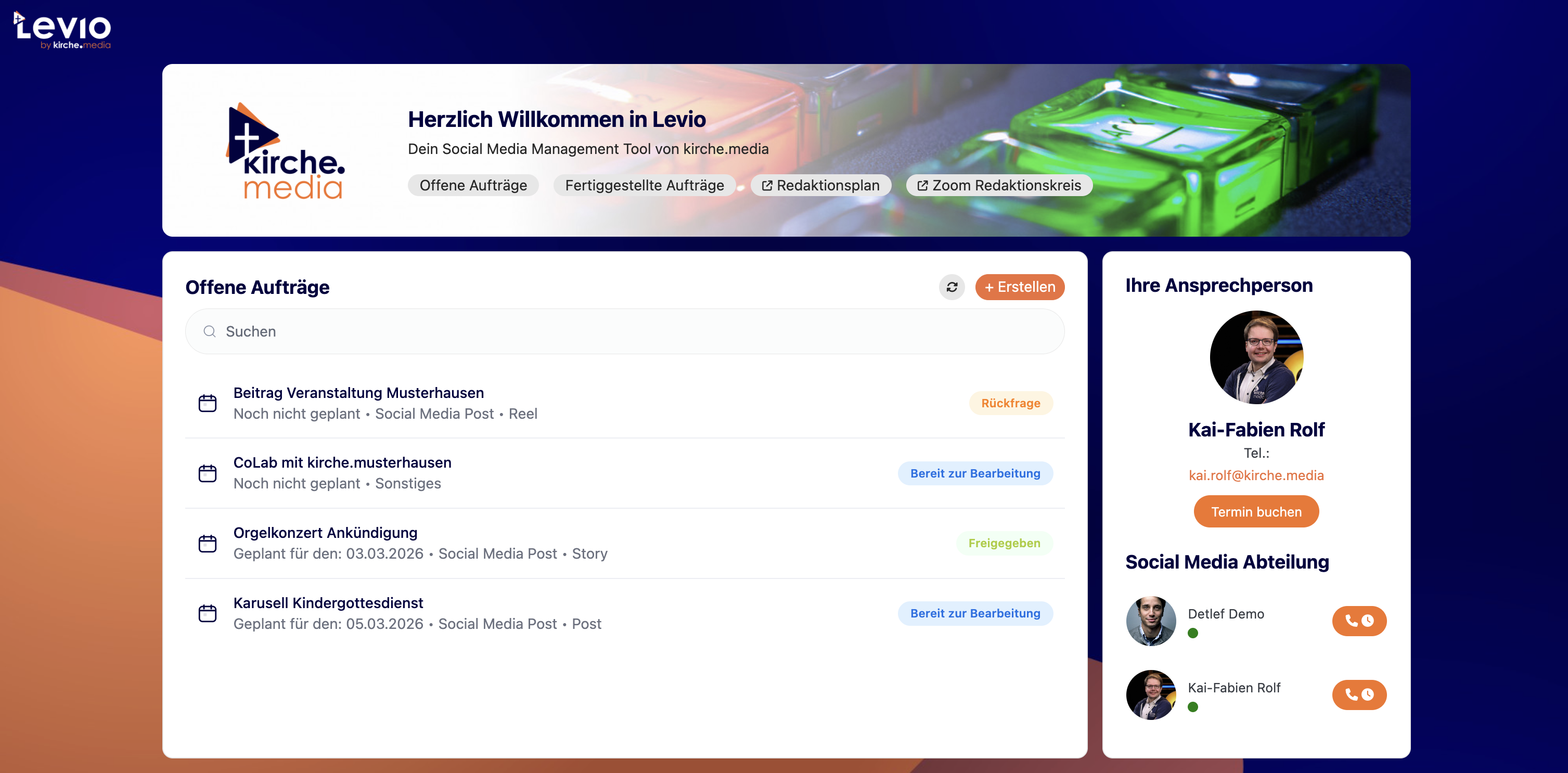 Hier findet du die Kontaktdaten zu deinem ersten Ansprechpartner von kirche.media. Diese Person ist dein Anlaufpunkt für alle Fragen rund um deinen Kanal. Du kannst auch direkt Sprechstunden mit der Person buchen und Kontakt aufnehmen. Außerdem sieht du darunter, welche weiteren Mitarbeiter:innen aus dem Team online sind, also wer an diesem Tag im System und im Einsatz ist.