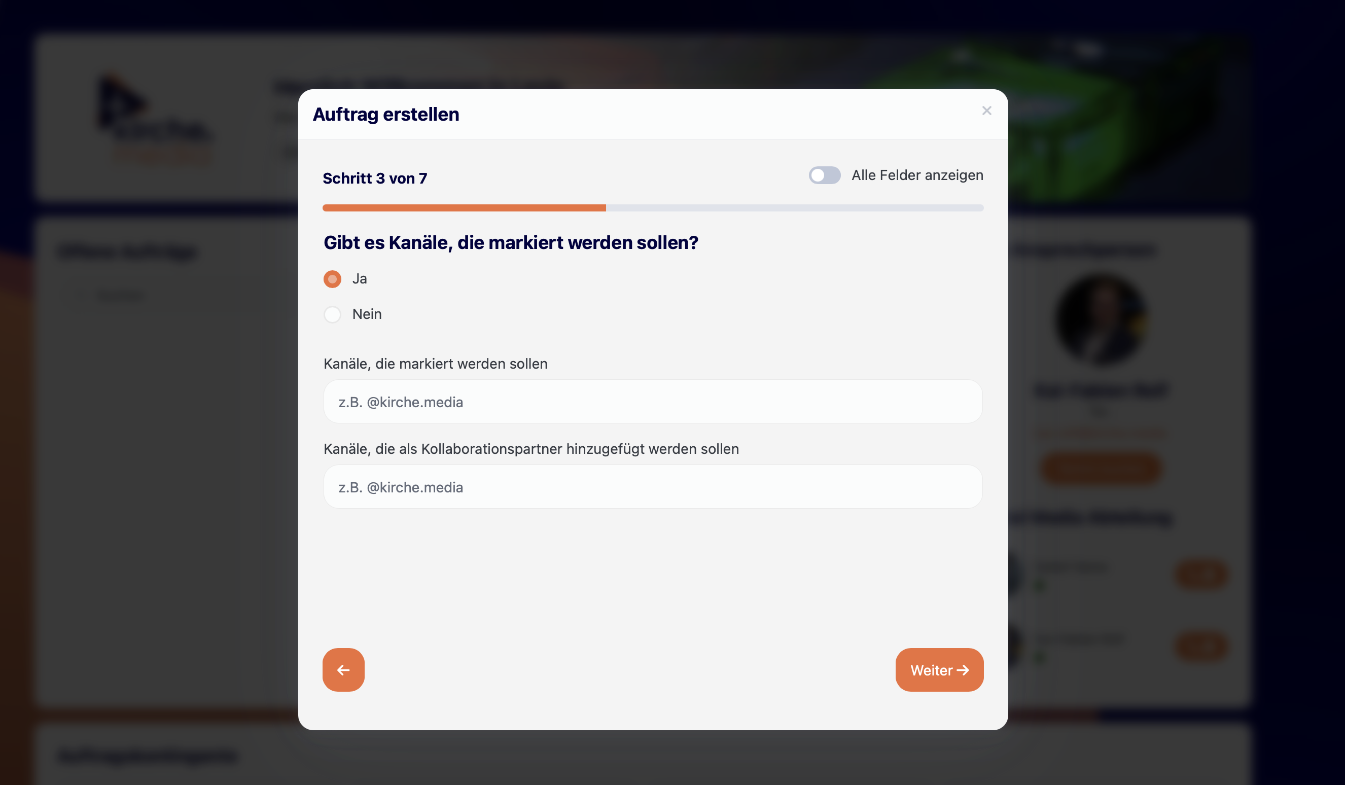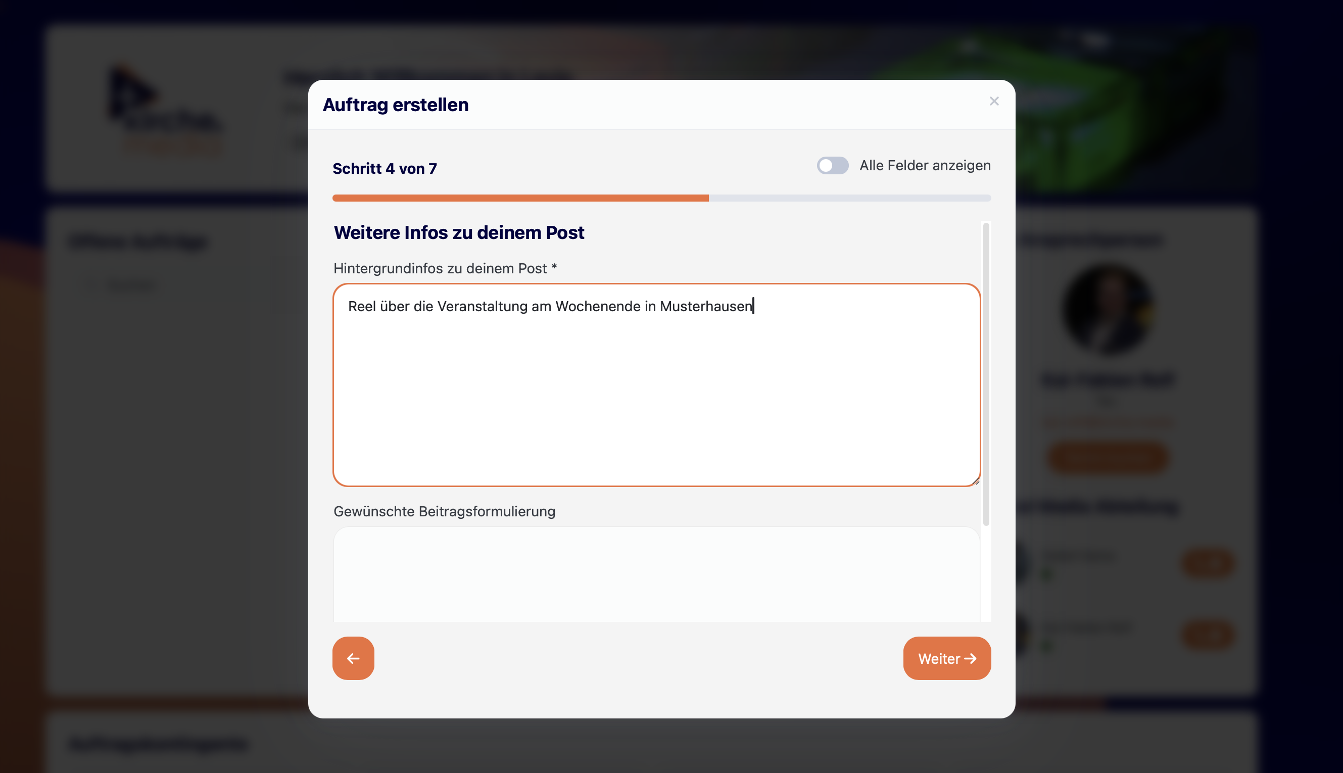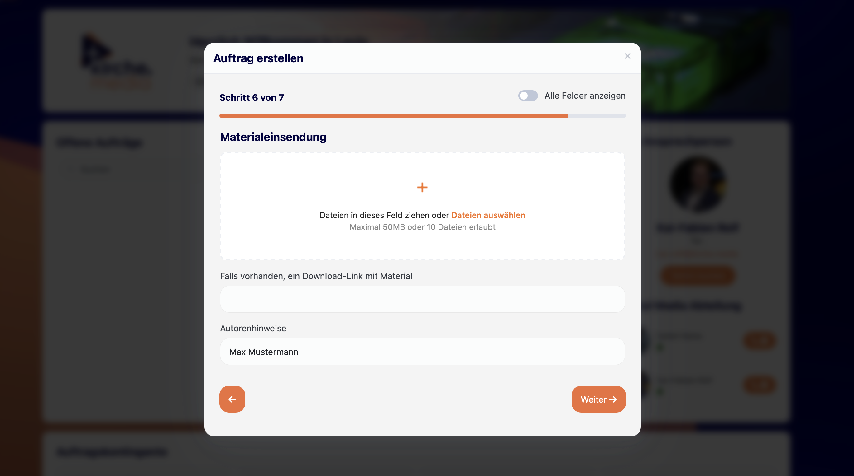 Das Feld „Hintergrundinfos“ ist ein Pflichtfeld – ohne Infos kann der Auftrag nicht eingereicht werden.