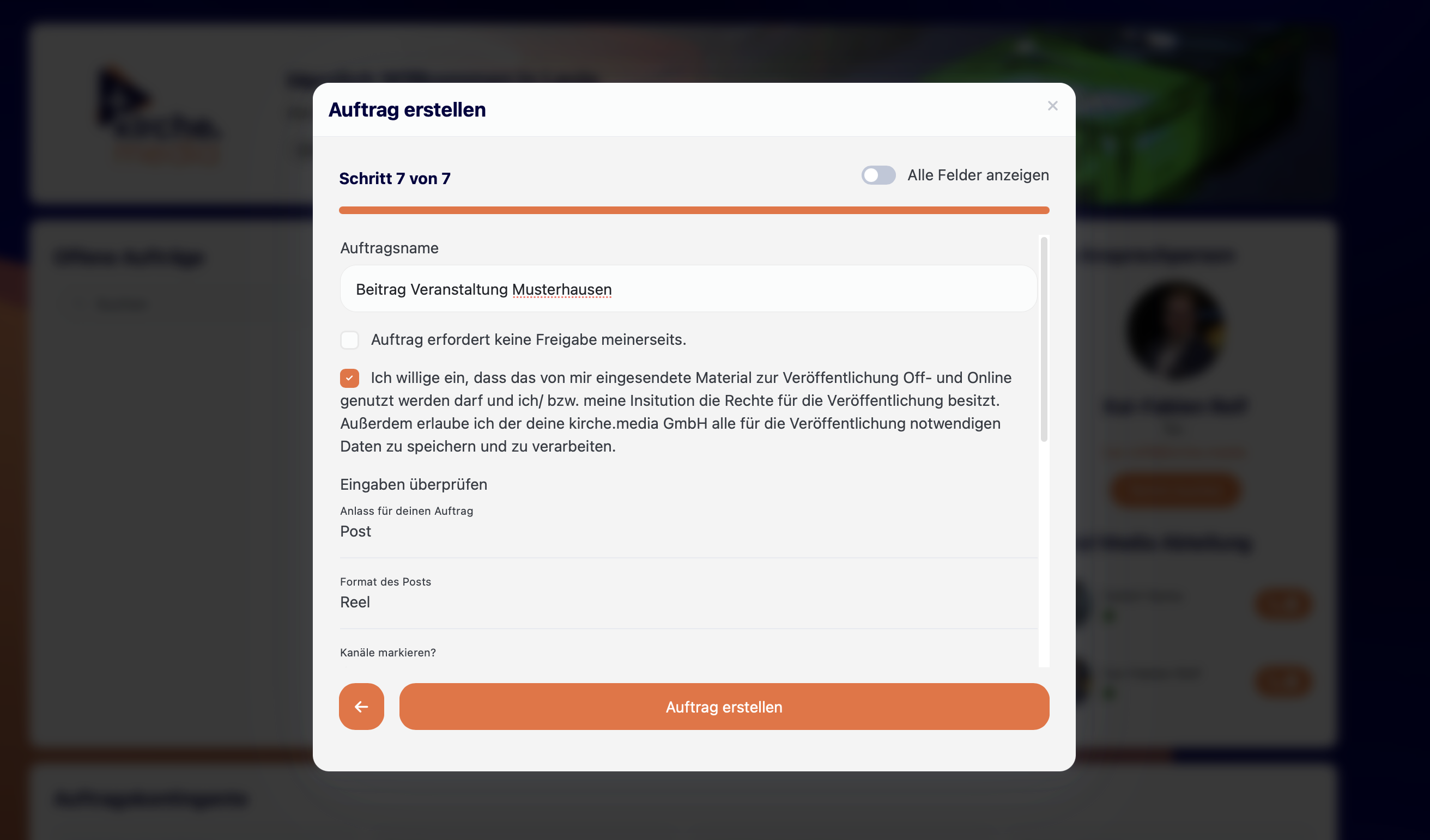 Am Ende siehst du eine Übersicht deiner Eingaben. Wenn alles korrekt ist, klickst du auf die orangefarbene Schaltfläche „Auftrag erstellen“ – schon wird dein Auftrag an unser Team übermittelt und erscheint bei dir unter „Offene Aufträge“.