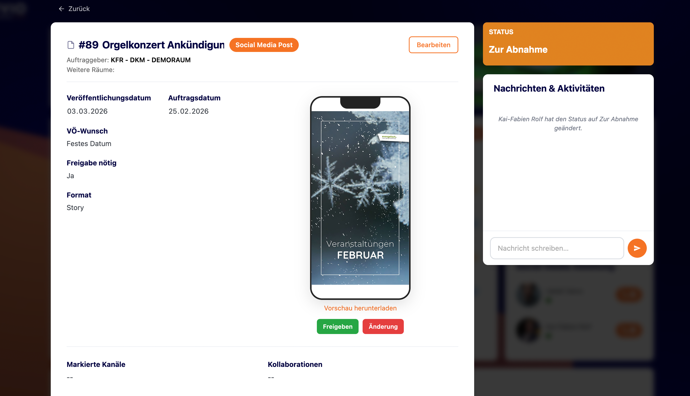 Kunde hat den Post abgenommen; kirche.media übernimmt den Post dann ins CMS zur Veröffentlcihung. |