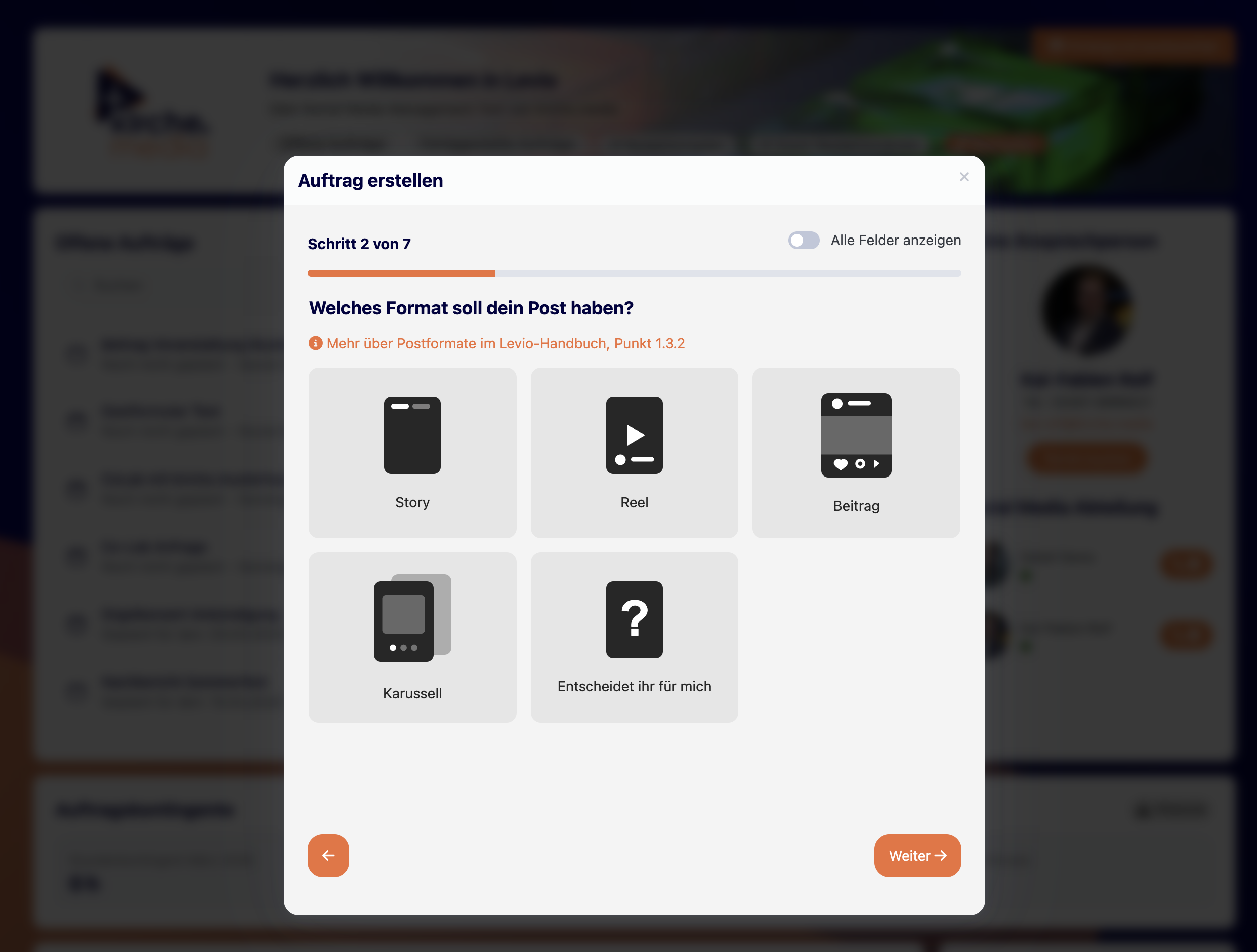 Im zweiten Schritt entscheidest du, in welchem Format dein Beitrag veröffentlicht werden soll.