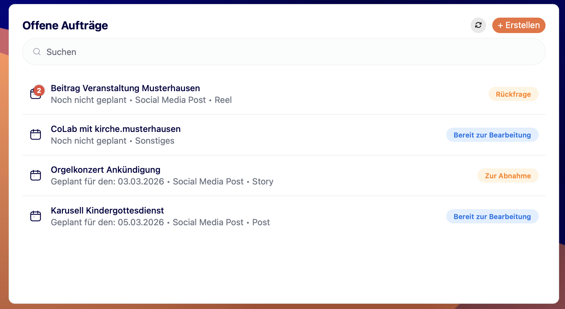 Über die Suchfunktion oben kannst du gezielt nach Posts suchen. Sobald ein Post von kirche.media final eingeplant wurde verschiebt sich der Auftrag nach unten in den Reiter "Fertiggestellte Aufträge", unabhängig davon ob dieser bereits veröffentlich wurde.