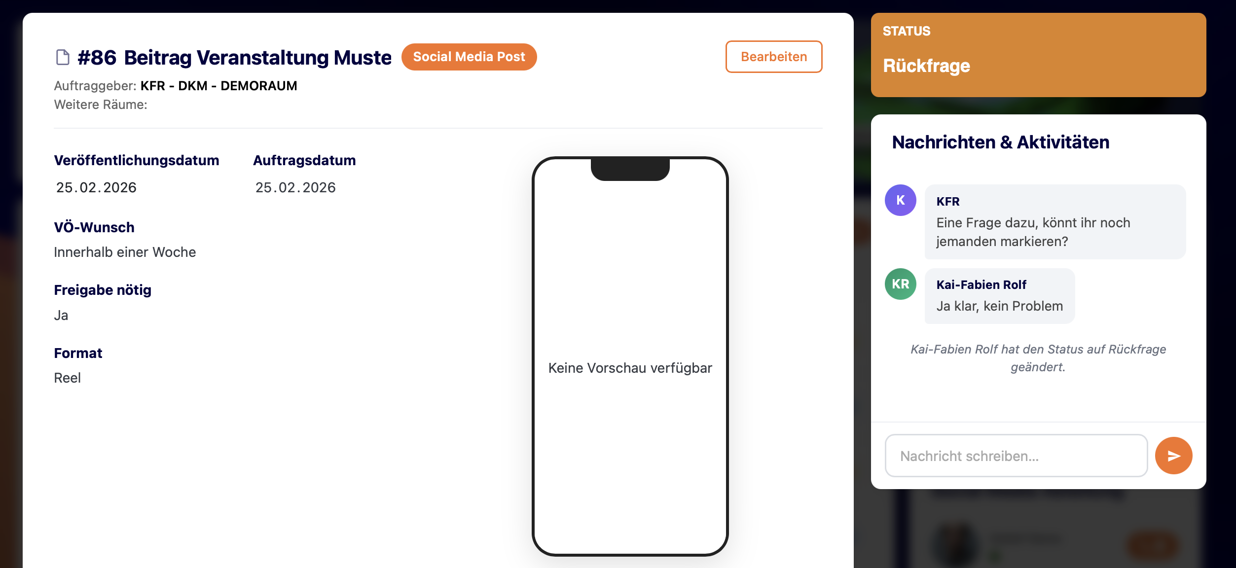 Wenn ein Auftrag in den Status „Rückfrage“ wechselt, brauchen wir kurz deine Unterstützung. In diesem Fall hat eine Mitarbeiter:in von kirche.media eine Rückfrage zu deinem Auftrag. Diese findest du im Nachrichtenfenster des jeweiligen Auftrags. Dort kannst du direkt darauf antworten.