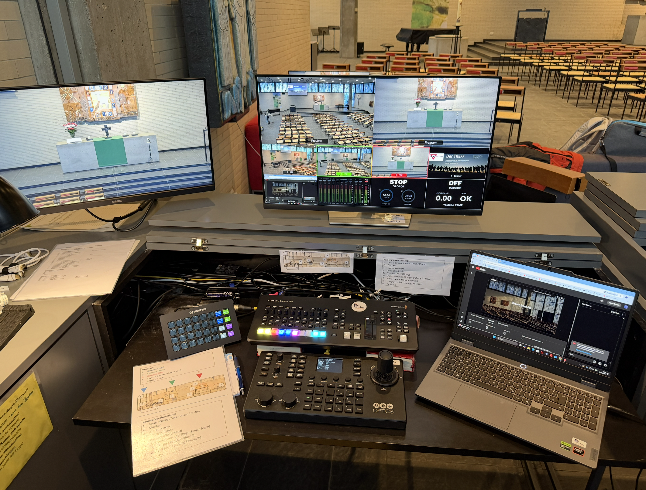 Im Mittelpunkt der Installation steht ein Blackmagic ATEM Mini Extreme ISO G2, der als zentrale Schaltstelle für Bildmischung, Aufzeichnung und Streaming dient. Ergänzend durch ein Pult zur Steuerung der drei fest eingebauten PTZ Kameras von PTZ Optics.